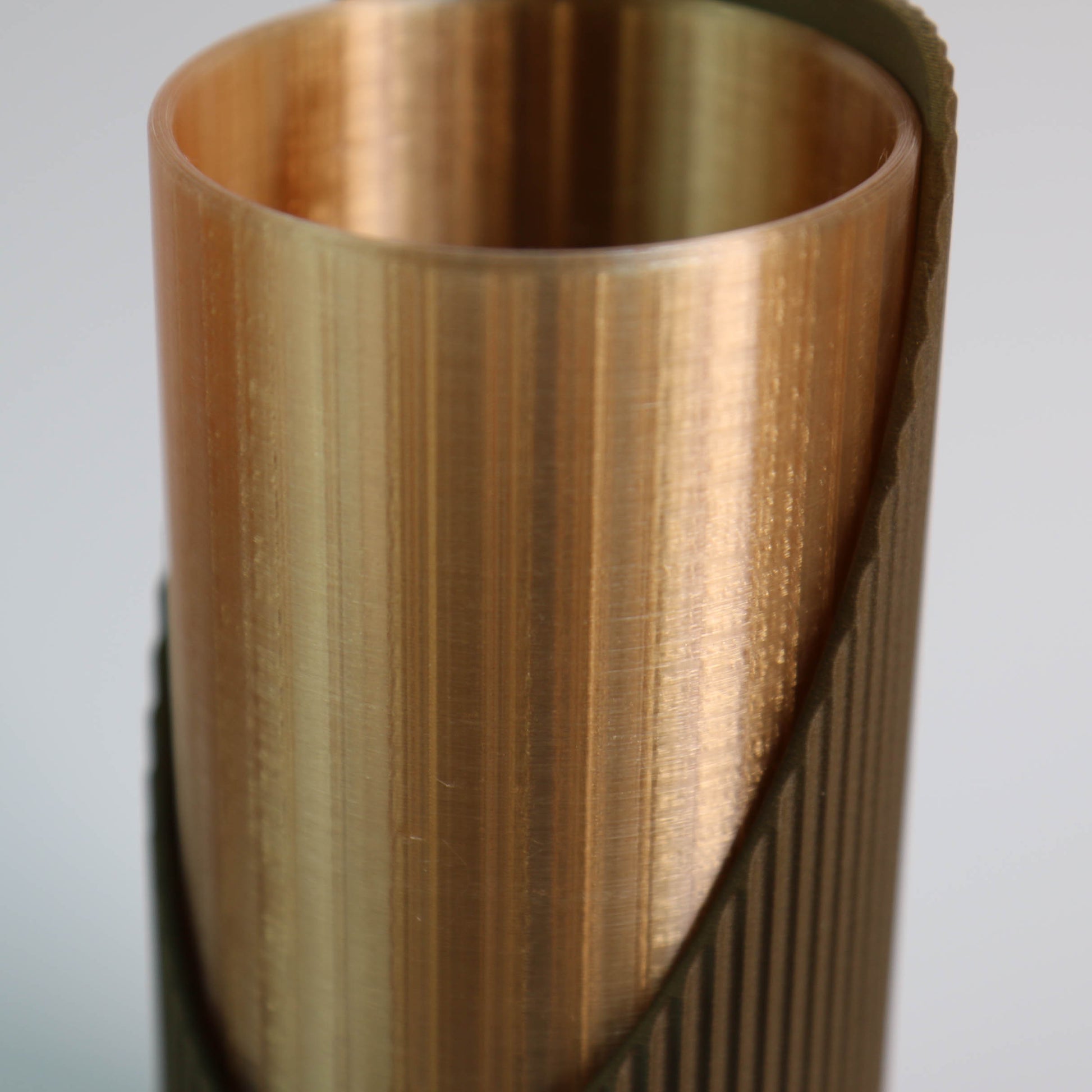 Diese stilvolle Vase vereint modernes Design mit innovativer 3D-Druck-Technologie. Der äußere Teil besteht aus hochwertigem PLA mit feiner Struktur, der innere Einsatz ist aus robustem PETG gefertigt und dadurch wasserresistent.